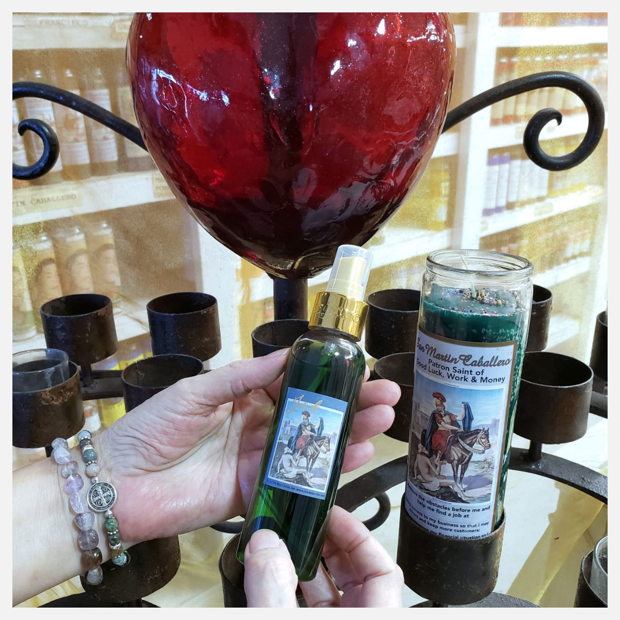 Set de Vela y Spray San Martín Caballero Enciende una vela de San Martín Caballero y rocíala con perfume en spray a diario si estás buscando trabajo, quieres un ascenso o mejorar la liquidez en casa o en tu negocio. El Santo Patrón de la buena suerte, el trabajo y el dinero. La vela espiritual se fija con hierbas mágicas, aceites espirituales y cristales curativos.